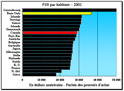 Cet écart se traduit par une différence entre les salaires ou niveaux de vie des deux pays. En dollars comparables, et en utilisant la formule de parité des pouvoirs d’achat de Statistique Canada pour 1998 (1 $CAN = 0,83 $US) et le dégonfleur implicite du PIB de 2001, Industrie Canada estime que les Canadiens sont, en moyenne, plus pauvres de 8 200 $ que les Américains. Cette estimation est calculée selon la différence entre les PIB par habitant des États-Unis (43 142 $) et du Canada (34 942 $)(4).