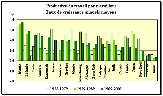 Le fait que le taux de croissance de la productivité du travail au Canada se soit légèrement amélioré au cours des années 1990 par rapport à celui enregistré au cours des années 1980 ne signifie pas pour autant que la productivité n’a joué aucun rôle dans le déclin du niveau de vie canadien par rapport à celui des autres pays de l’OCDE. De fait, le bilan du Canada sur le plan de la productivité a été inférieur à celui de la plupart des pays de l’OCDE au cours des deux dernières décennies, comme le montre le graphique 4. Le Canada s’est classé seizième sur 21 pays de l’OCDE pour son taux de croissance de la productivité du travail par travailleur entre 1973 et 2001. Il est donc tombé du deuxième au quatrième rang dans le classement de l’OCDE pour la productivité entre 1976 et 2001(3).