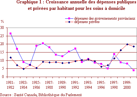 Ce rationnement éventuel incite de plus en plus de citoyens à recourir à des solutions à l’extérieur du réseau public. À moins que le financement des soins à domicile du réseau public n’évolue au même rythme que la demande de soins, cette tendance s’accentuera avec le vieillissement de la population. Entre 1999‑2000 et 2000-2001, les dépenses privées par habitant pour les soins à domicile ont bondi de 18,6 p. 100, alors que les dépenses des gouvernements provinciaux au même titre n’ont augmenté que de 3,9 p. 100(24).