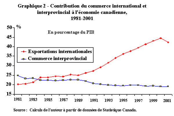 S’agissant du commerce interprovincial, des études confirment qu’au moins une portion du commerce du Canada avec les États-Unis provient d’une réorientation des échanges interprovinciaux(8), même s’il est difficile de chiffrer cette réorientation avec précision. Alors même que le commerce avec les États-Unis a grimpé depuis les années 1980, le commerce interprovincial a décliné en importance dans l’ensemble de l’économie canadienne. En 1981, les échanges interprovinciaux représentaient environ le quart de la production économique du Canada, tandis que les exportations internationales (à destination de tous les pays) constituaient environ 20 p. 100 du PIB. Vingt ans plus tard, le commerce interprovincial était tombé à un cinquième du PIB, tandis que les exportations internationales se situaient à 43 p. 100 du PIB.