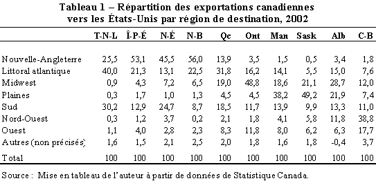 L’ancienne orientation est-ouest de l’économie canadienne a graduellement fait place à une série de relations nord-sud. Ce changement se manifeste au niveau des exportations des provinces prises individuellement. Comme le montre le tableau 1, les ventes des provinces à destination des États-Unis tendent à se concentrer dans les États voisins ou proches. Les provinces de l’Atlantique échangent beaucoup avec la Nouvelle-Angleterre et les États du centre du littoral de l’Atlantique. Le Québec et l’Ontario exportent également vers ces derniers États, mais aussi vers le Midwest, tandis que les exportations de la Saskatchewan et du Manitoba sont en grande partie destinées aux plaines américaines, ainsi qu’au Midwest. La répartition des exportations de l’Alberta se démarque légèrement de la tendance, puisqu’un volume important de pétrole et de gaz suit le parcours des grands pipelines. Enfin, les ventes de la Colombie-Britannique aux États-Unis sont concentrées dans les États du littoral ouest.