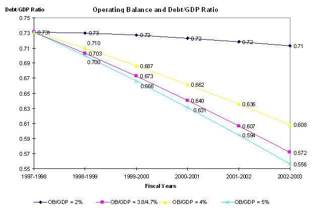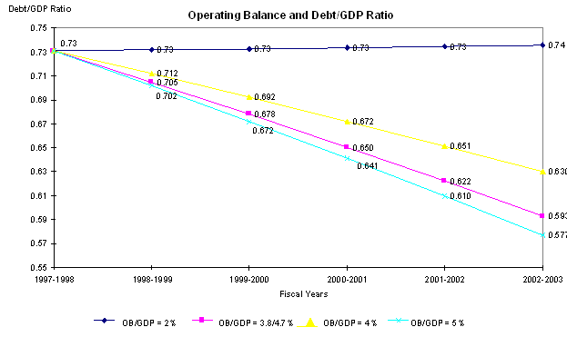 Figure 1 for 1997-98 and 4.7% for 1998-99 (private-sector projections) and an average rate of interest on the public debt of 7.7% for the entire period in question. The first simulation shows that a balance of 2% would simply stabilize the public debt relative to the GDP at around 73%. The second simulation uses the operating balances as a percentage of GDP given in the last budget, assuming that the 4.7% operating balance would not change after 1998-99. The third and fourth simulations use an operating balance as a percentage of GDP of 4% and 5% respectively. The four simulations clearly show that the higher the operating balance, the faster the decrease in the debt as a percentage of GDP. The recent drops in interest rates have already begun to have an impact on the cost of servicing the public debt. As medium- and long-term securities mature, they are refinanced at lower interest rates. Table 3 and Figure 2 assume that the average interest rate will gradually decrease from 7.7% to 6.8% beginning in 2002-03. In this new context, the debt/GDP ratio would decrease more quickly if operating balances were to stay the same. Now that the government has met its deficit reduction objectives, it has raised questions about the appropriate relative size of the debt. Some have argued that decreasing the debt/GDP ratio should be the primary objective of the next budgetary policies, while others maintain that keeping the debt/GDP ratio stable is the target to pursue. The traditional economic argument is that the government should endeavour to generate large operating balances in times of economic growth. Such a budgetary policy would make it possible to control the size of the debt when the next economic downturn comes, at which time the operating balance will most likely decrease. Moreover, decreasing the debt/GDP ratio when conditions permit would make it easier for the government to borrow money in the next slowdown and thereby stabilize the economy. Deteriorating economic conditions (for example, slower economic growth and higher interest rates) would force the government to come up with increasingly large operating balances in order to control the size of the debt. For example, assuming an average interest rate of 8.5%, nominal growth of 3%, and a debt to GDP ratio of 73%, the government would