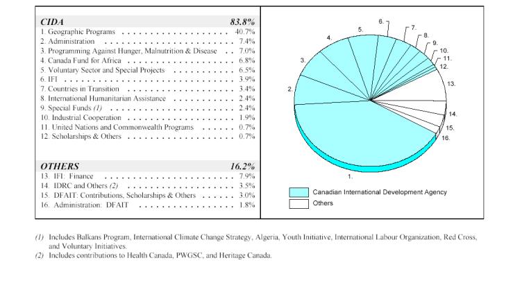 In addition to direct bilateral and multilateral assistance to other governments, ODA supports work on many small projects carried out by the Canadian voluntary sector, by international non‑governmental organizations (NGOs), and by private-sector partners in more than 100 countries. ODA consists of either grants or loans on highly concessional terms. Since 1986, all Canadian aid has been in grant form. CIDA’s spending constitutes about 84% of the IAE. The primary channel of delivery within CIDA is the geographic programs sector, which in 2003-2004 will receive 40.7% of the IAE. About 16% of the IAE is disbursed through the Department of Finance (for the IFIs), the International Development Research Centre (IDRC), the Department of Foreign Affairs and International Trade (DFAIT), and other departments. See Chart 1 for current data on channels of delivery.