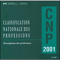 La Classification nationale des professions(CNP) est la taxonomie officiellement reconnue à l'échelle nationale des professions qui forment la marché du travail canadien et elle en constitue le cadre organisationnel. L'édition 2001 de la CNP remplace la version originale ainsi que la Classification type des professions (CTP), système parallèle datant de 1991 de Statistique Canada.(Aussi disponsible: affiche, version CD-ROM, Index de appellations d'emploi.)La Classification nationale des professions (CNP) décrit les professions des Canadiens et permet de normaliser la compréhension de la nature du travail. Les statisticiens, les analystes du marché du travail, les conseillers d'orientation professionnelle et les particuliers qui se cherchent un emploi disposent ainsi d'un système pour structurer et interpréter les statistiques et d'autres éléments factuels sur le marché du travail. (Développement des resources humaines Canada)