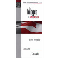 Ce dépliant donne un aperçu du budget fédéral de 2003. Il traite de la performance économique et des perspectives financières du Canada et énumère les investissements clés – soins de santé, familles et collectivités, sécurité, innovation et compétences, amélioration du régime fiscal, et développement durable – qui s’inscrivent dans les trois principaux thèmes du budget : bâtir la société à laquelle les Canadiens tiennent, bâtir l’économie dont les Canadiens ont besoin, et bâtir le système de reddition de comptes que les Canadiens méritent. Décrit comment obtenir des renseignements complémentaires sur le budget.